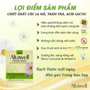 - Khăn lau vệ sinh Altawell giúp cân bằng, duy trì pH sinh lý phù hợp để tạo môi trường thích hợp cho lợi khuẩn phát triển, chăm sóc sức khỏe vùng kín toàn diện cho phụ nữ